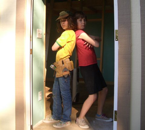 Stewardship Manager Clauda Costa, wearing her toolbelt, with her twin sister at age 11 in a Tierra Verde home.