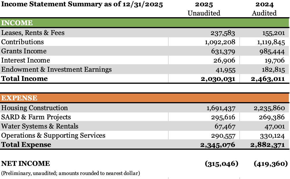The amounts shown on these statements are preliminary and subject to adjustments made during our regular audit. If you’d like a copy of our audited 2024 statements, please inquire. We expect to have our audited 2025 statements completed later in 2026.