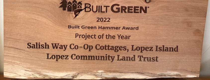 On September 15, 2022, LCLT staff member, Marly Schmidtke, attended the 2022 Master Builders Association (MBA) of King and Snohomish Counties conference and award ceremony. During the awards ceremony LCLT received the Built Green Hammer Project of the Year award! Built Green is the green home certification program of the MBA. LCLT received 5-star certification for Salish Way, a housing neighborhood completed in 2021. Salish Way homes achieved 30% energy use improvement above current WA State Code and will purchase community solar through OPALCO when the project becomes available.